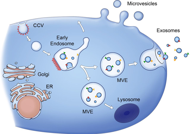 外泌體(exosome)直徑40-100nm,作為一種活細(xì)胞分泌的亞細(xì)胞成分,外泌體中含有細(xì)胞特異的蛋白、脂質(zhì)和核酸,能作為信號(hào)分子傳遞給其他細(xì)胞從而改變其他細(xì)胞的功能,起到調(diào)節(jié)細(xì)胞狀態(tài)與功能的作用。它可以在細(xì)胞之間運(yùn)輸和轉(zhuǎn)移生物活性分子,如蛋白質(zhì)和RNA,介導(dǎo)靶向細(xì)胞間信號(hào)傳遞,甚至是遺傳信息的功能性轉(zhuǎn)移,是細(xì)胞間通訊的重要介質(zhì)。
